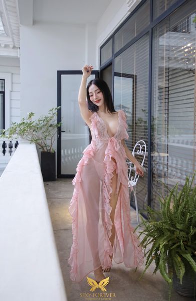 ✿ Váy ngủ Jasmine dáng dài xuyên thấu, cùng những chi tiết siêu quyến rũ từ phối ren ngực và bèo voan rũ dọc thân đến thiết kế cổ V sâu, xẻ tà trước, vừa gợi cảm vừa thanh lịch.